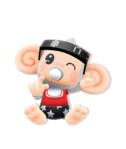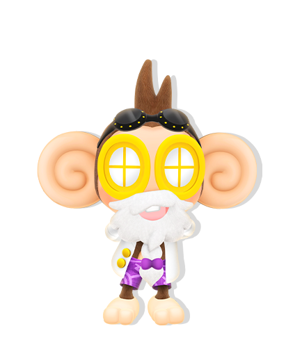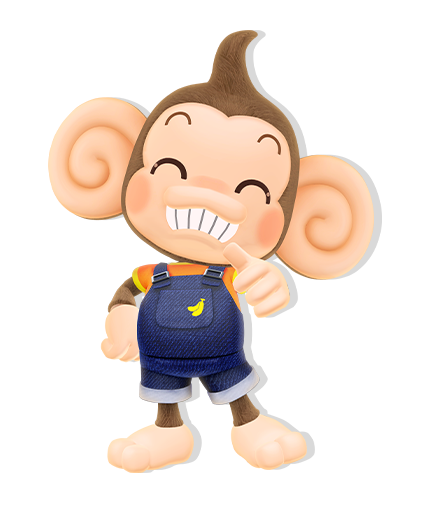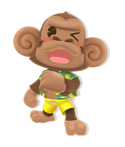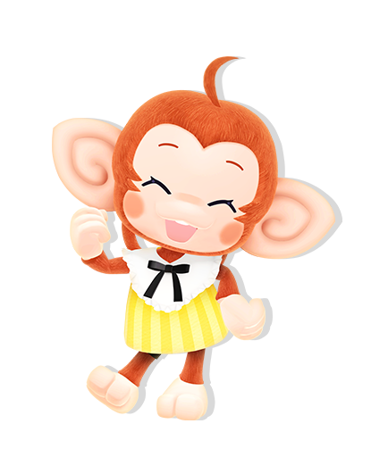 バナナが大好きでいつもバナナのことを考えているよ。元気いっぱいで、おっちょこちょいだけどいざというときにはとてもたよりになるおサルだよ。